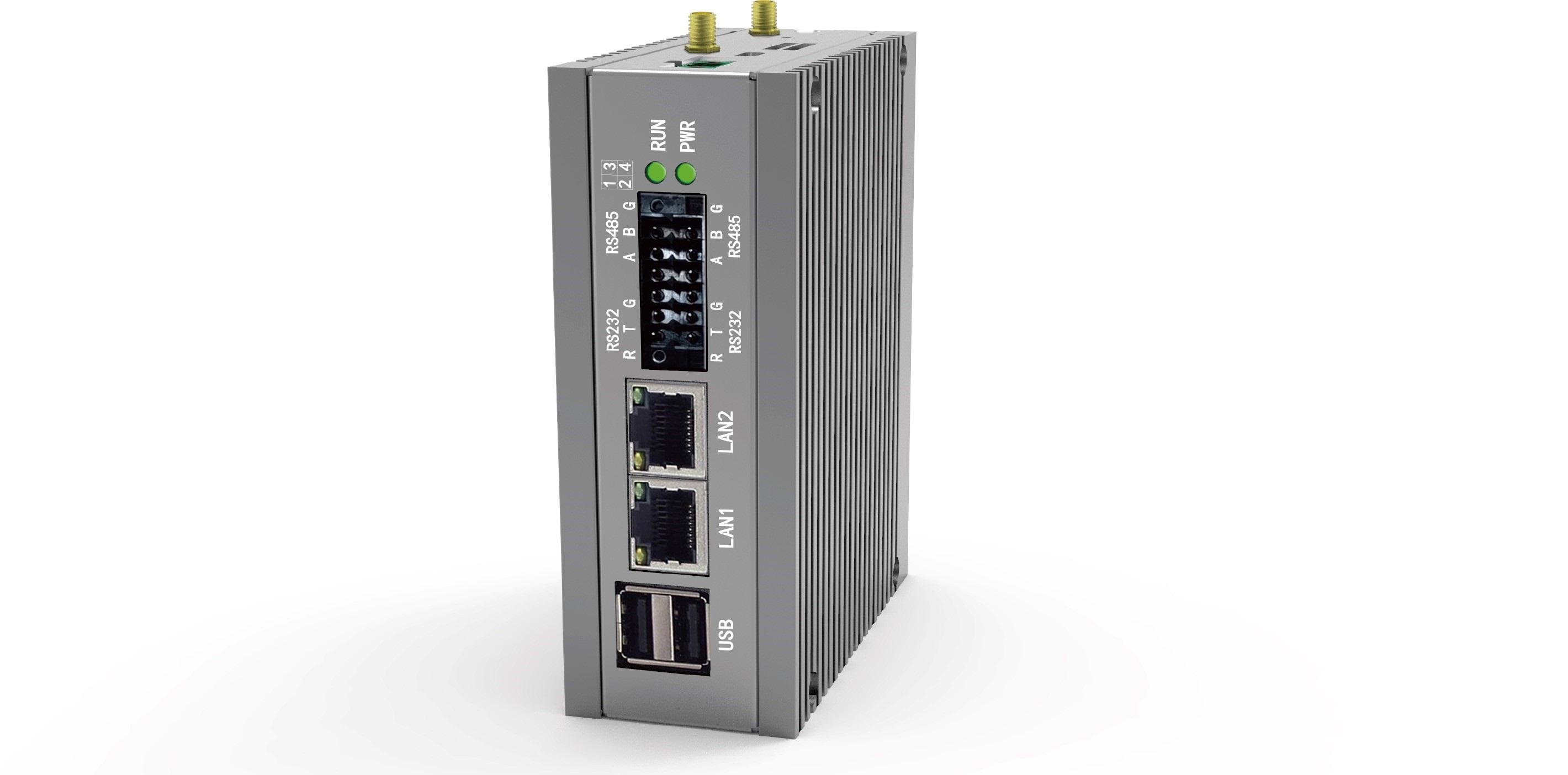 本网关提供两个有线网口 , 可选型号支持 WiFi 和 4G, 同时提供两个 485 两个 232 接口 , 电源支持 12V 输入电压。