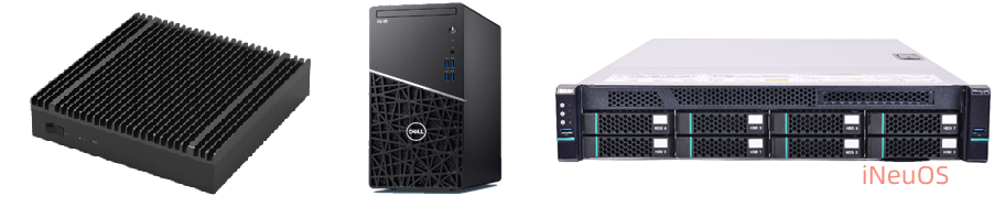 算力、算法和模型部署在 AI边缘计算盒子、 AI智能计算主机和 AI智能计算服务器上,根据视频识别的场景需求配置相应的硬件。硬件如下图: