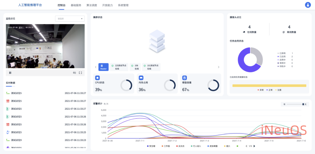 硬件内部嵌入系统管理系统,主要负责统计数据及视频预览页面,对当前信息进行集成化展示,便于管理人员方便查看和管理,主要功能包括:控制台、基础服务、算法调度、开放能力和系统管理。如下图:
