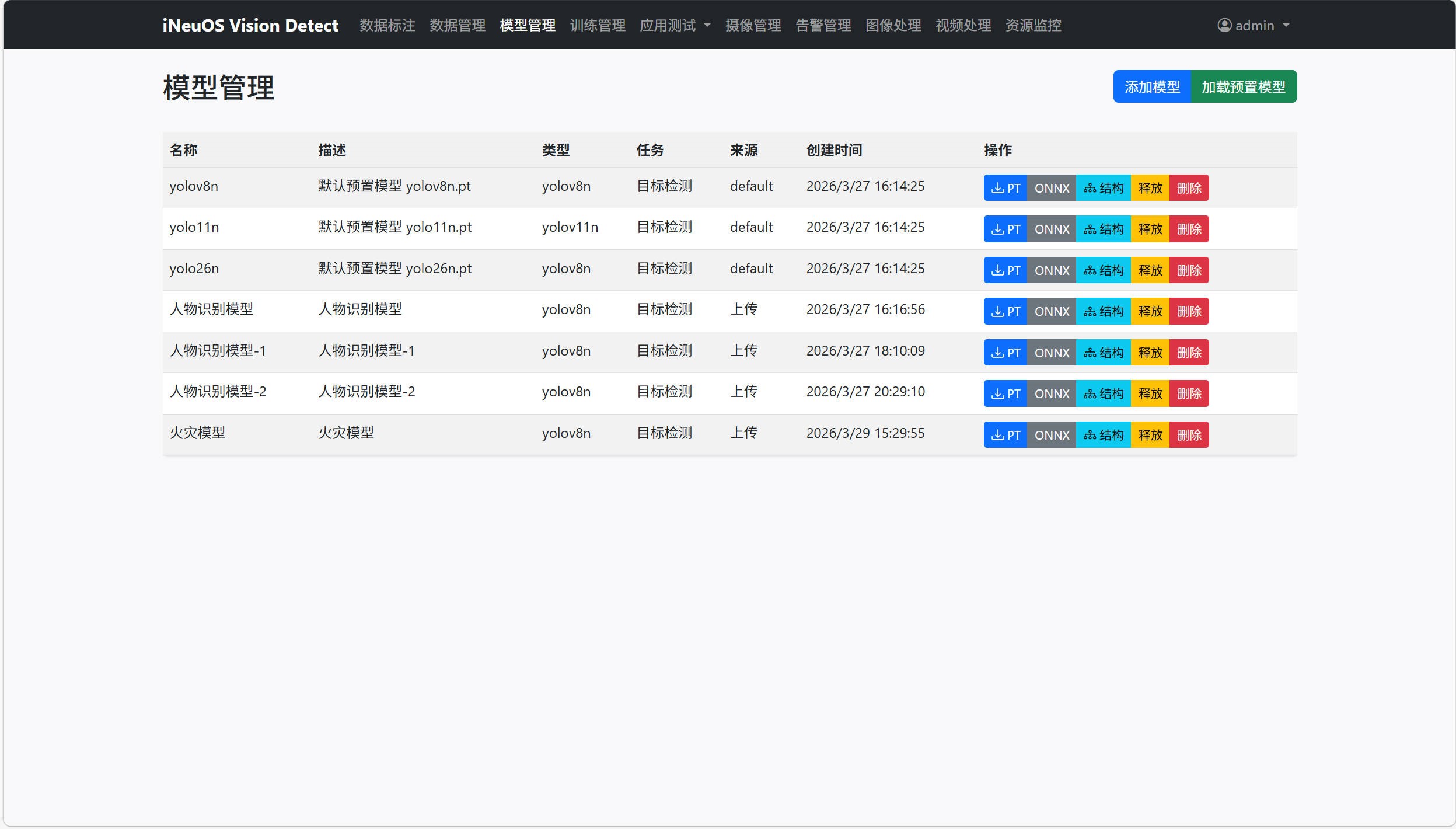 iNeuOS Vision Detect是面向机器视觉训练、测试、管理和应用的管理平台,覆盖数据标注、数据管理、模型管理、训练管理、应用测试、摄像管理、告警管理、图像处理、视频处理与资源监控等业务闭环。平台支持从数据到模型再到业务应用的全流程管理,可用于快速构建“可训练、可部署、可运营”的视觉智能系统。