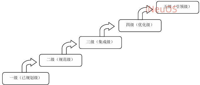 成熟度等级自低向高分别是一级(已规划级)、二级(规范级)、三级(集成级)、四级(优化级) 和五级(引领级),测 评等级分类如下图: