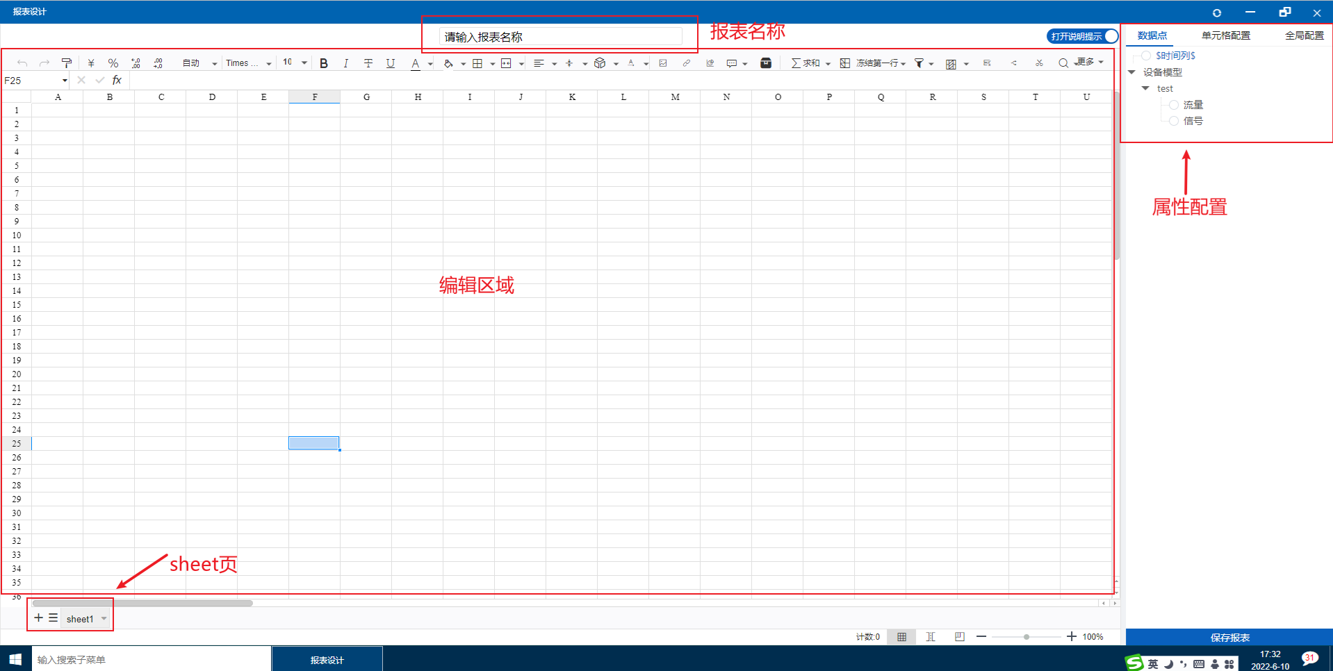 可以自定义报表名称、中间是编辑区域、下面是sheet页、右边是数据源及属性配置区域。如下图: