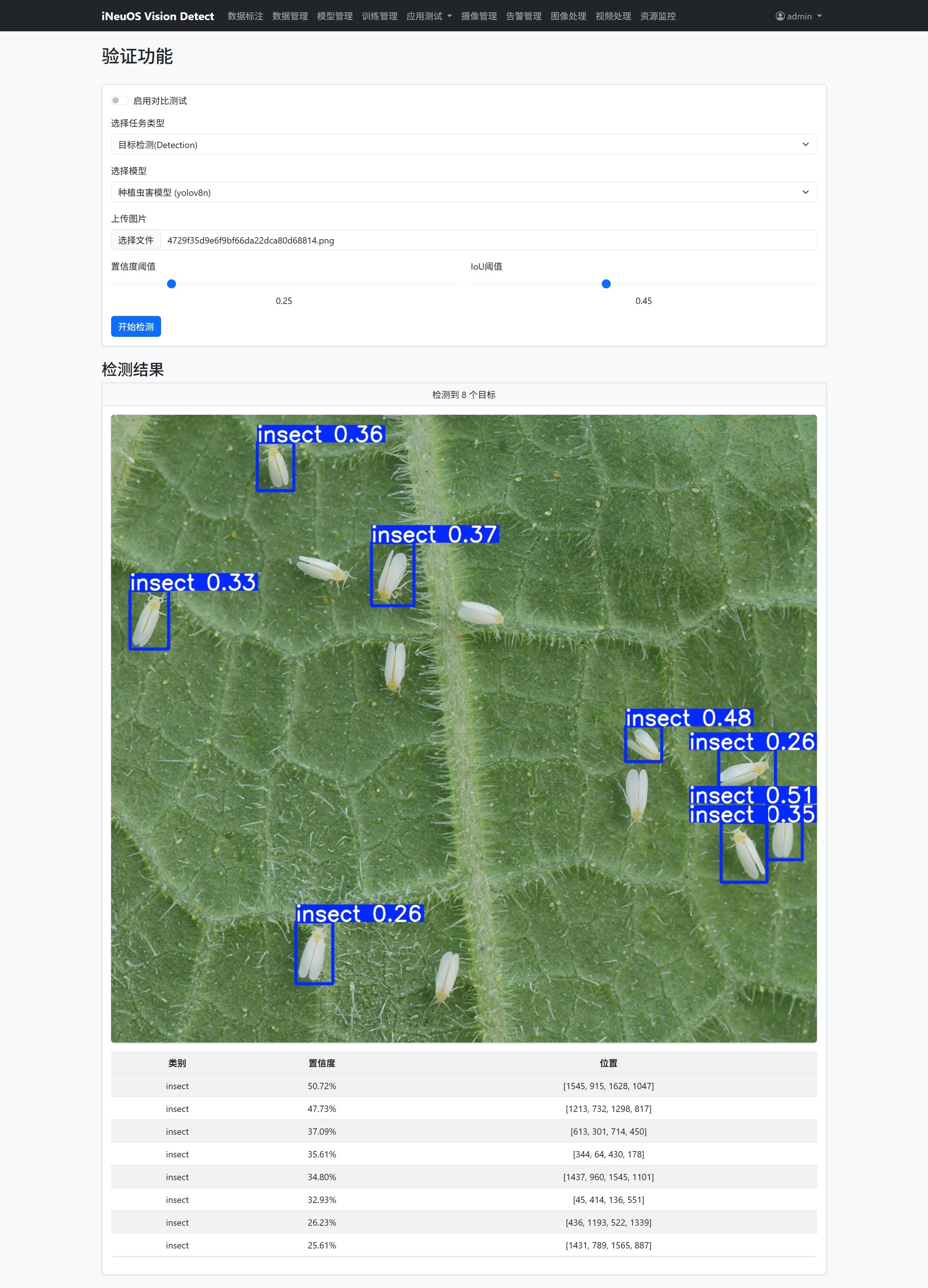 iNeuOS Vision Detect是面向机器视觉训练、测试、管理和应用的管理平台,覆盖数据标注、数据管理、模型管理、训练管理、应用测试、摄像管理、告警管理、图像处理、视频处理与资源监控等业务闭环。平台支持从数据到模型再到业务应用的全流程管理,可用于快速构建“可训练、可部署、可运营”的视觉智能系统。