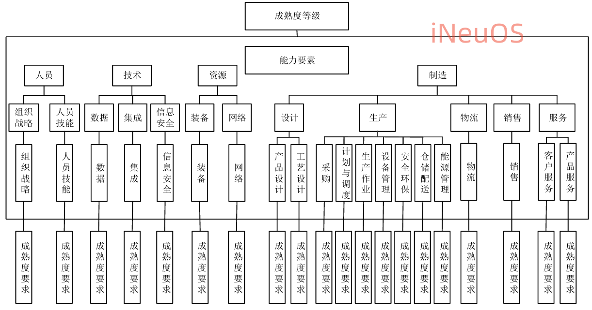 成熟度等级规定了企业智能制造 能力在不同阶段应达到的水平,能力要素给出了智能制造能力成熟度提升的关键方面,成熟度要求规定 了能力要素在不同成熟度等级下应满足的具体条件。等级测评模型如下图: